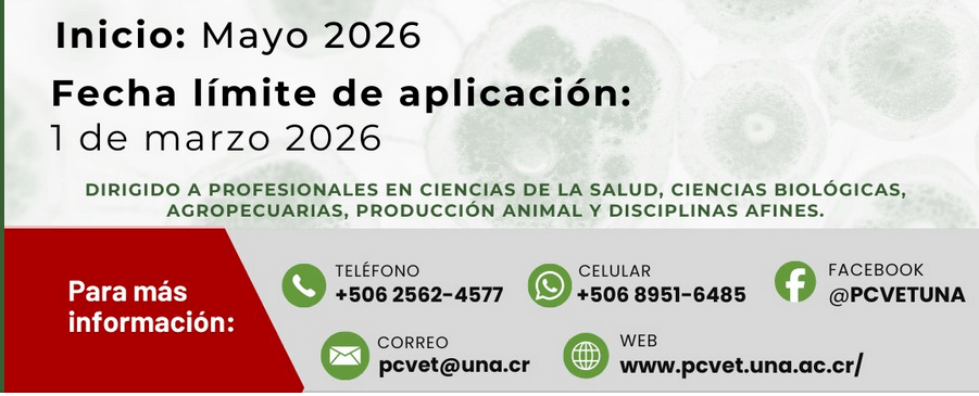 La Escuela de Medicina Veterinaria de la Universidad Nacional (UNA), a través del Posgrado Regional en Ciencias Veterinarias (PCVET), informa que permanece abierta la convocatoria para la Maestría en Enfermedades Tropicales, la cual está dirigida a profesionales de las áreas de salud, ciencias biológicas, agropecuarias, producción animal y disciplinas afines. El plazo de postulación vence el 1 de marzo de 2026.