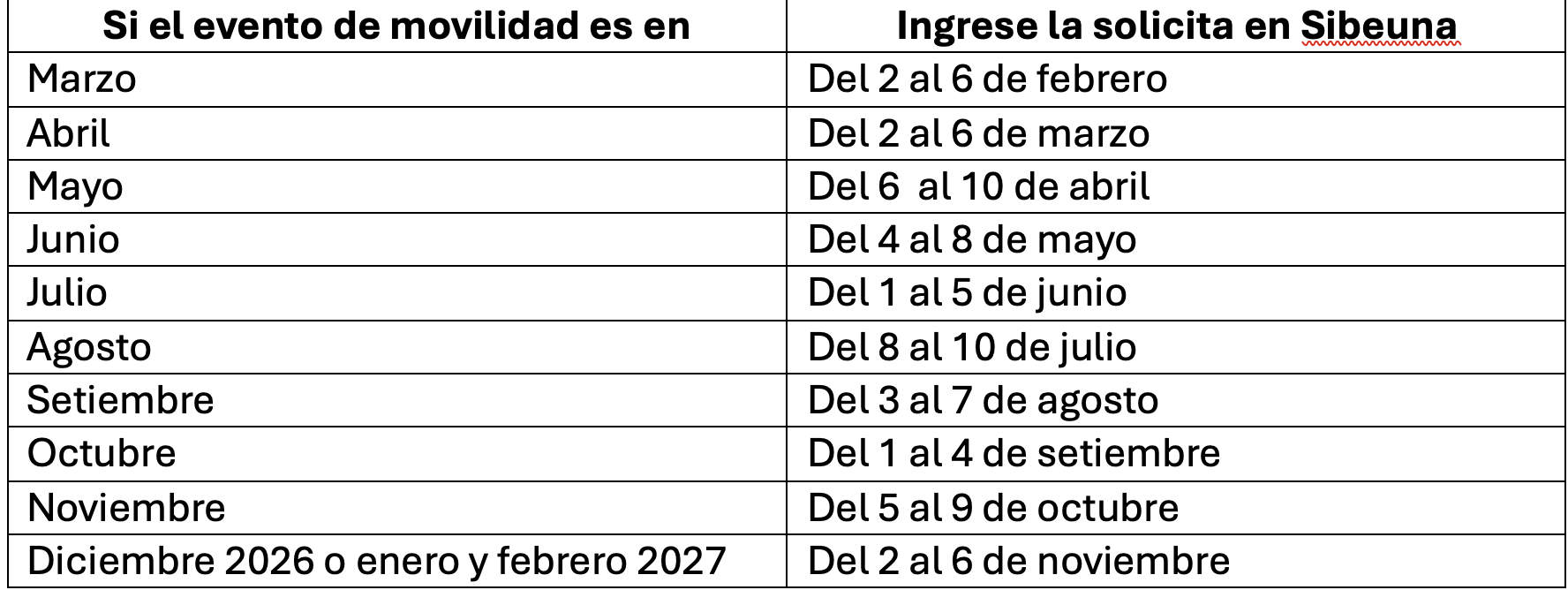 Las convocatorias se abren cada mes con fechas definidas entre febrero y noviembre de 2026, según el mes del evento de movilidad.