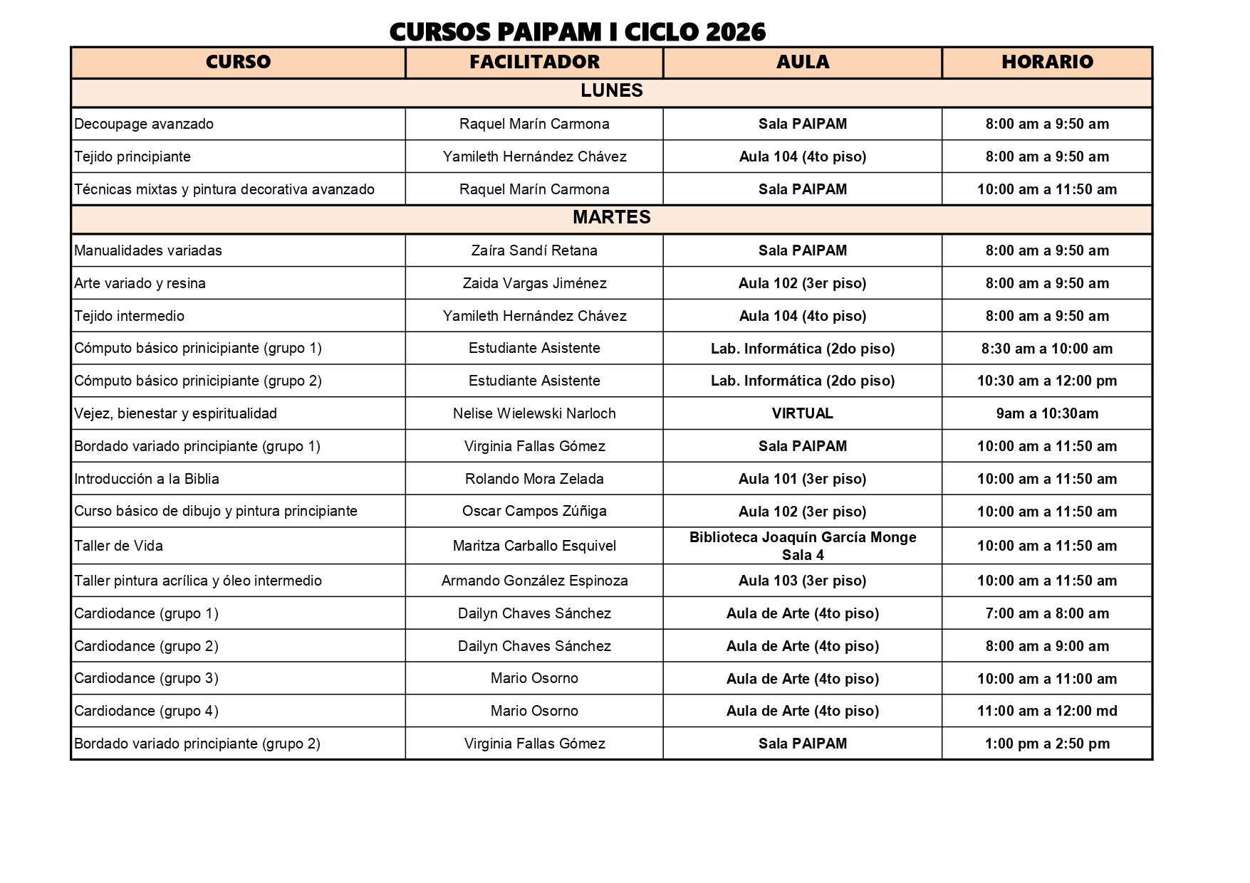 La oferta académica forma parte de las acciones del PAIPAM dirigidas a la población adulta mayor. Los cursos y la matrícula no tienen costo. Cuando alguna actividad requiere materiales específicos, estos deben ser cubiertos por cada participante. Las clases iniciarán el 2 de marzo, según el cronograma establecido.