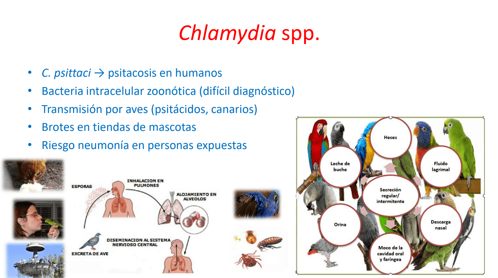 La psitacosis: ocasionada por una bacteria intracelular (Chlamydia psittaci) de difícil diagnóstico, transmitida por aves mediante secreciones y heces, se describió en más de 400 especies, incluidas algunas como mascotas (cockatieles, palomas y canarios). En humanos puede causar neumonía, y en casos menos frecuentes, complicaciones como endocarditis o encefalitis; al inicio los síntomas pueden parecer inespecíficos. “En 2014, un adulto mayor se infectó por sus cockatieles y gracias al reconocimiento clínico oportuno – basado en el contacto con aves y la valoración de un médico familiarizado con la enfermedad- fue determinante para su manejo”, subrayó la experta. También hay positividad en varias especies animales evaluadas en Costa Rica.
