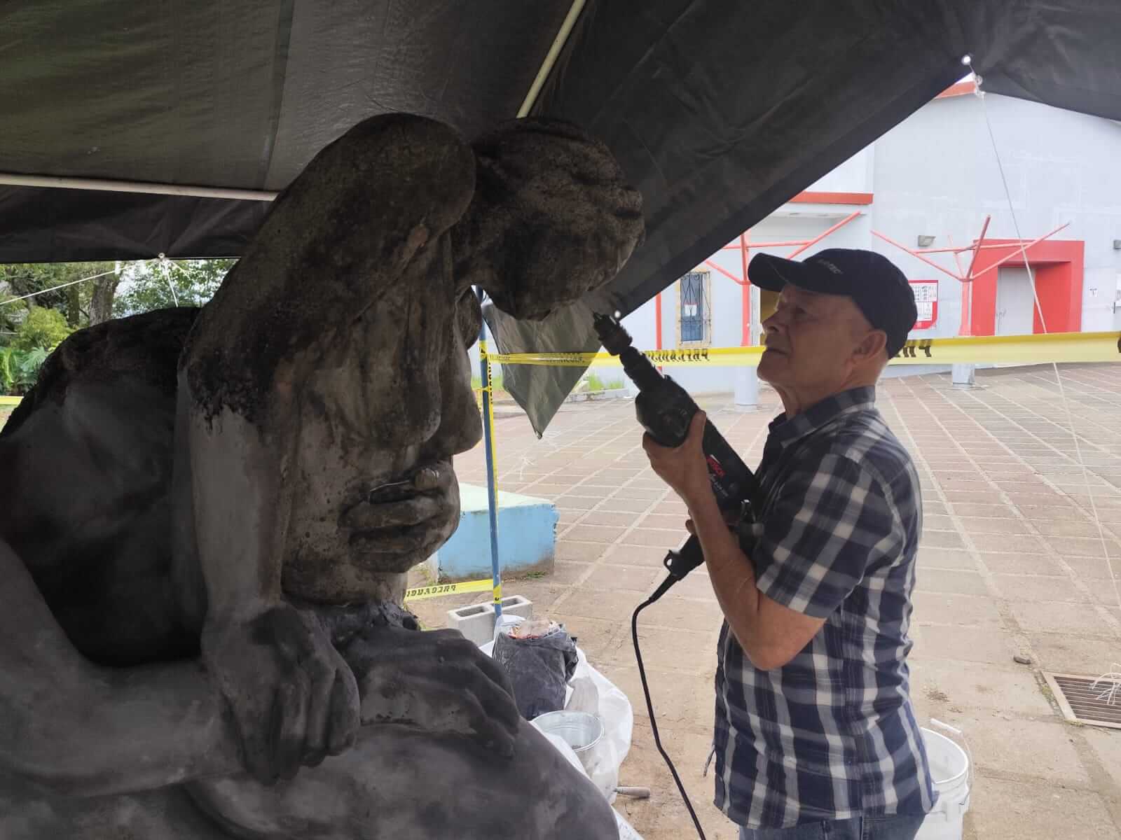 En la nueva base se coló cemento y arena para sujetar la obra. Además, se hizo un segundo lavado para eliminar algas y líquenes de la superficie de la escultura. A la obra se le aplicó mortero de cemento de arena fino con espátula en toda la superficie, se le colocaron pernos faltantes, se aplicó el resanado de los faltantes (dedos y nariz). Se da un tiempo de secado antes de aplicar un nuevo acabado a la base y a la obra. Tras el sellado, nuevamente se dio un tiempo de secado.