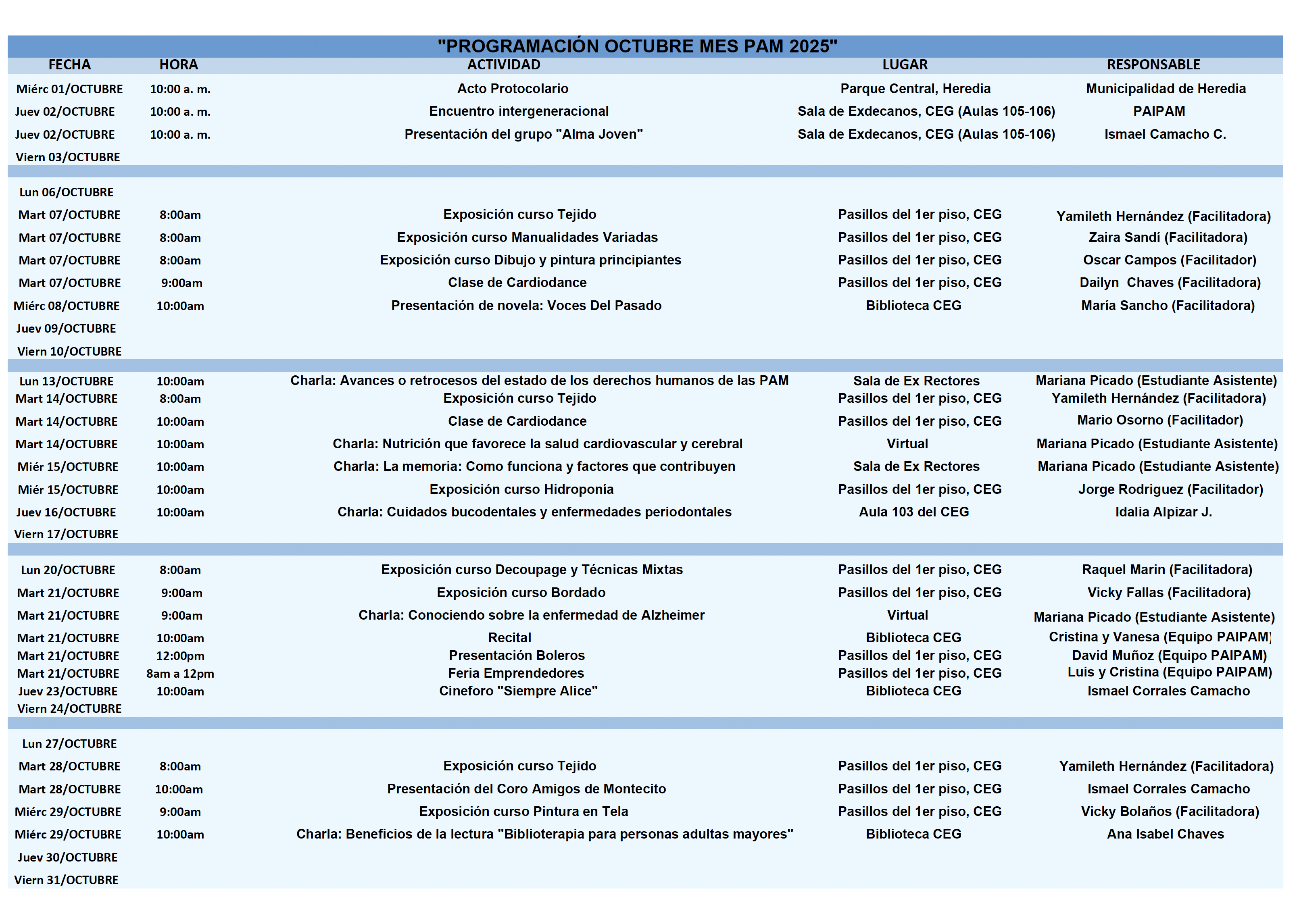 La Universidad Nacional (UNA), a través del Programa de Atención Integral de la Persona Adulta Mayor (PAIPAM) del Centro de Estudios Generales (CEG), celebra durante octubre el Día Internacional de la Persona Adulta Mayor con un calendario de actividades para adultos mayores.